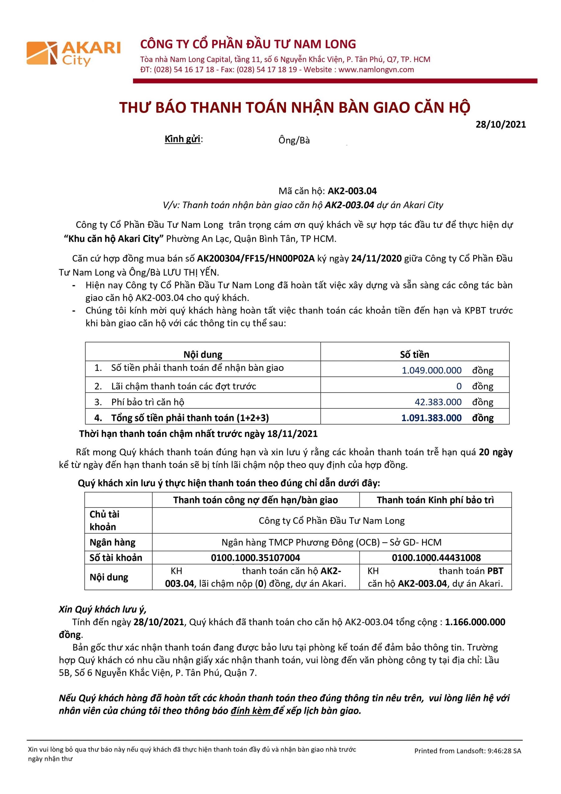 Thư báo thanh toán bàn giao Căn hộ Akari City