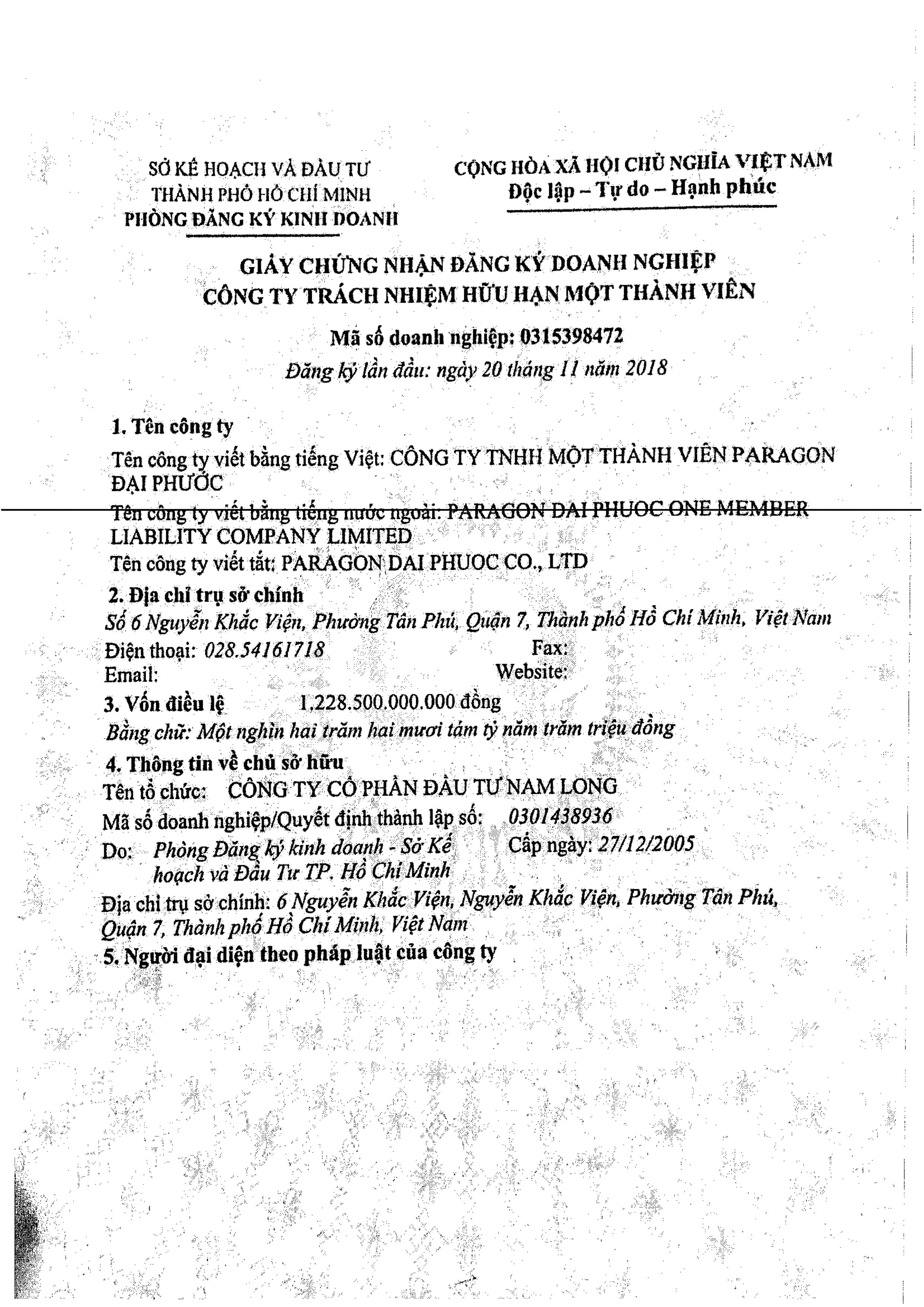 Chủ Đầu Tư CÔNG TY TNHH MỘT THÀNH VIÊN PARAGON ĐẠI PHƯỚC